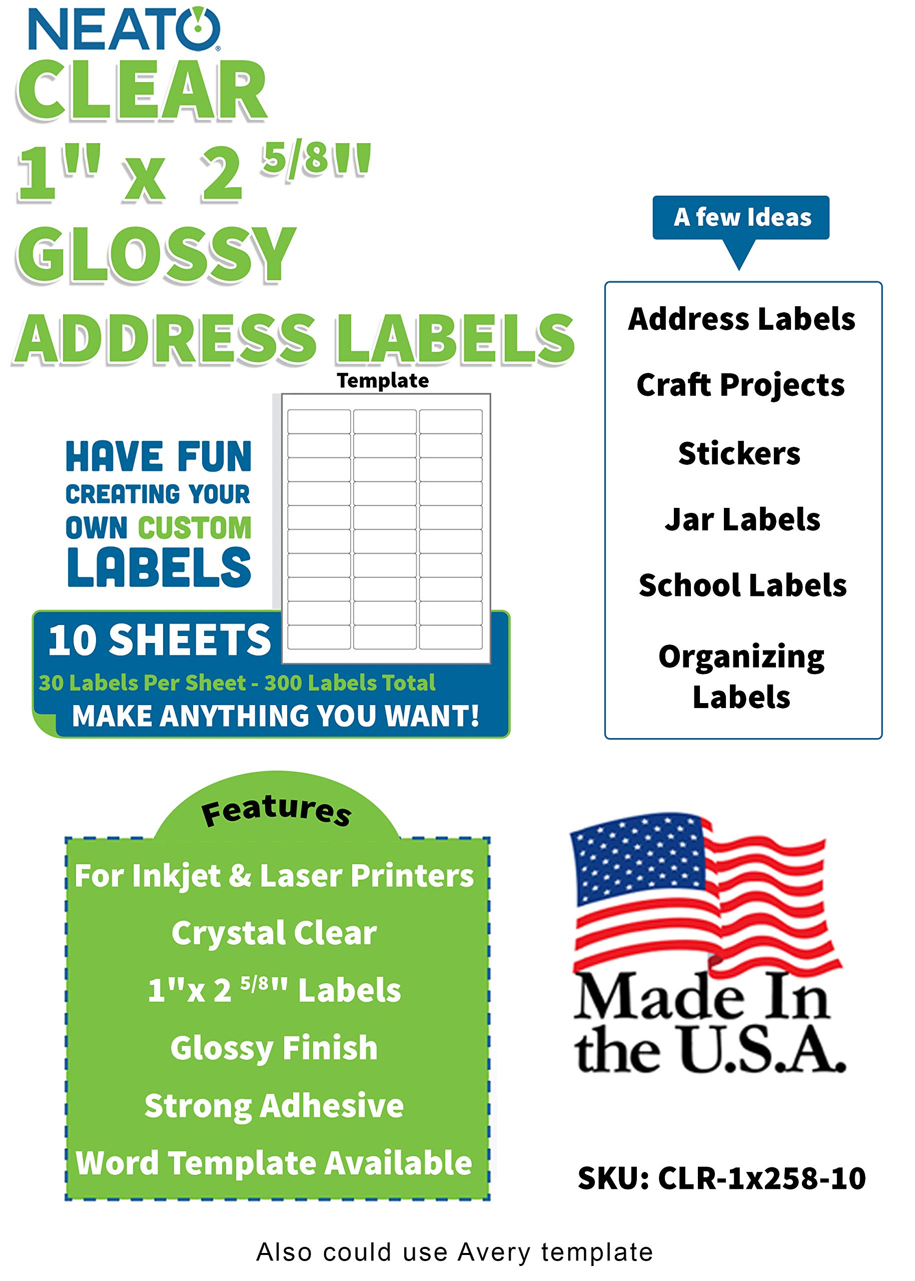 Neato Clear Address Label Set – 10 Sheets of Printable Glossy 1″ x 2 5/8″ Mailing Labels, 30 Per Sheet- 300-Piece Set of Tear Resistant Personalized Print Envelope Labels for Inkjet & Laser Printer- Amazon.com