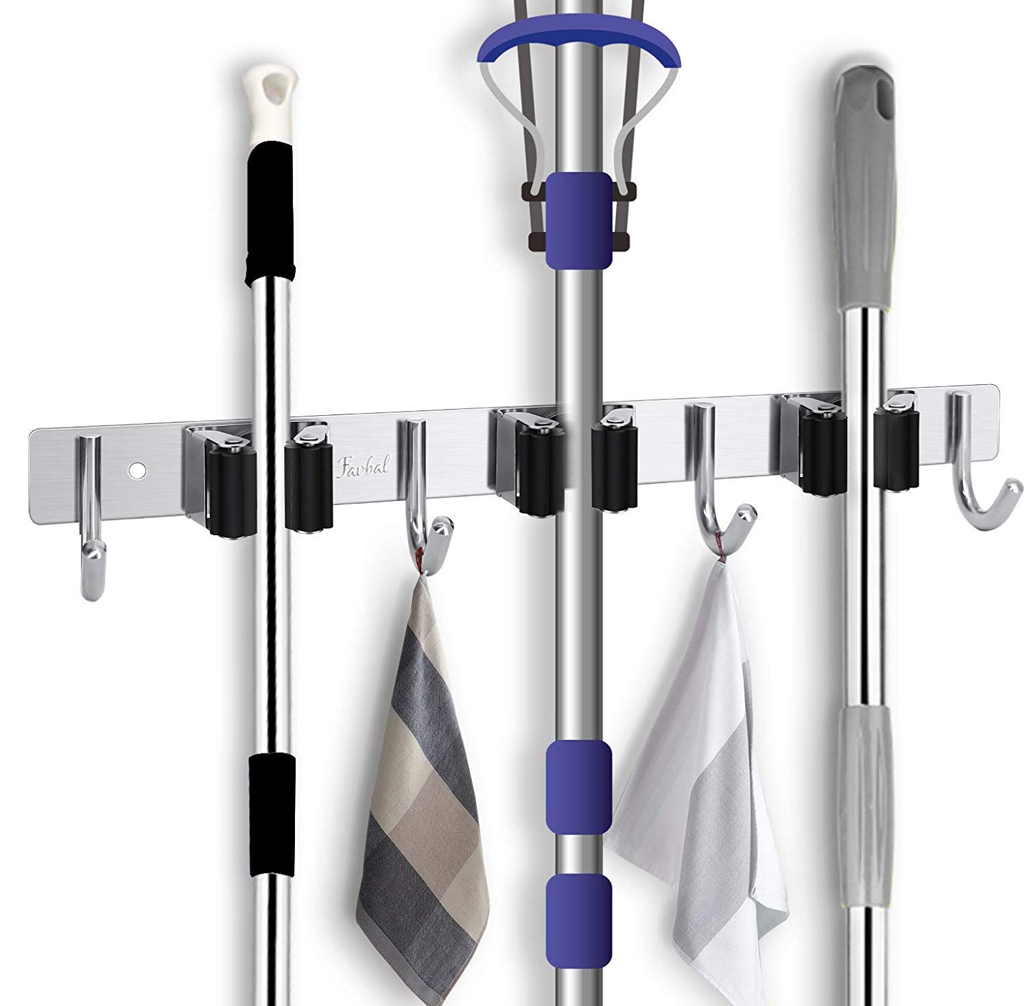 Favbal Broom Mop Holder Wall Mount Stainless Steel Wall Mounted Storage Organizer Heavy Duty Tools Hanger with 3 Racks 4 Hooks for Kitchen Bathroom Closet Office Garden- Amazon.com