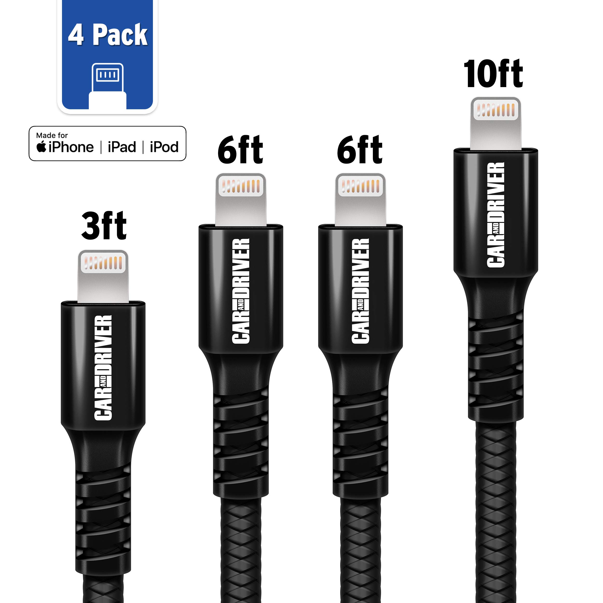 Car and Driver Apple MFI Certified Premium Nylon Braided 4 Pack (3ft, 6ft X2, 10 Ft) Lightning Cable for iPhone Chargers, iPhone Xs/XS Max/XR/X/8/8 Plus /7/7 Plus/ 6/6 Plus/ 5s, iPad Pro Air 2 & More- Amazon.com