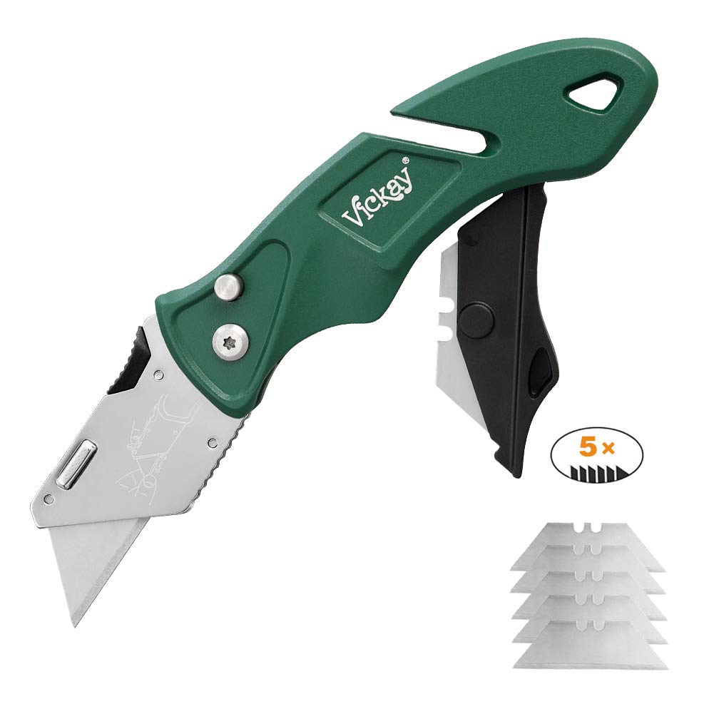 Folding Utility Knife – Heavy Duty Box Cutter with Quick Change Blades, 5 Positions Safety Lock-Back Design, Blades Storage Compartment, 5 Extra SK5 Blades for Office, Home, Arts Crafts(Green)- Amazon.com