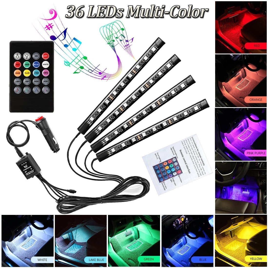 Car LED Strip Light for Cars,36 LED Car Interior Lights 12V Multicolor RGB Interior Car Atmosphere Neon Lights Under Dash Lighting Kit with Music Sounds Activated Wireless Remote Control (12V,36 Leds)- Amazon.com