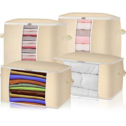 4 PACK Foldable Clothes Storage Bags Large Capacity Closet Organizer with Sturdy Handles and Zippers for Bedding,Clothes,Comforters, Blankets Clear Window (Beige)- Amazon.com