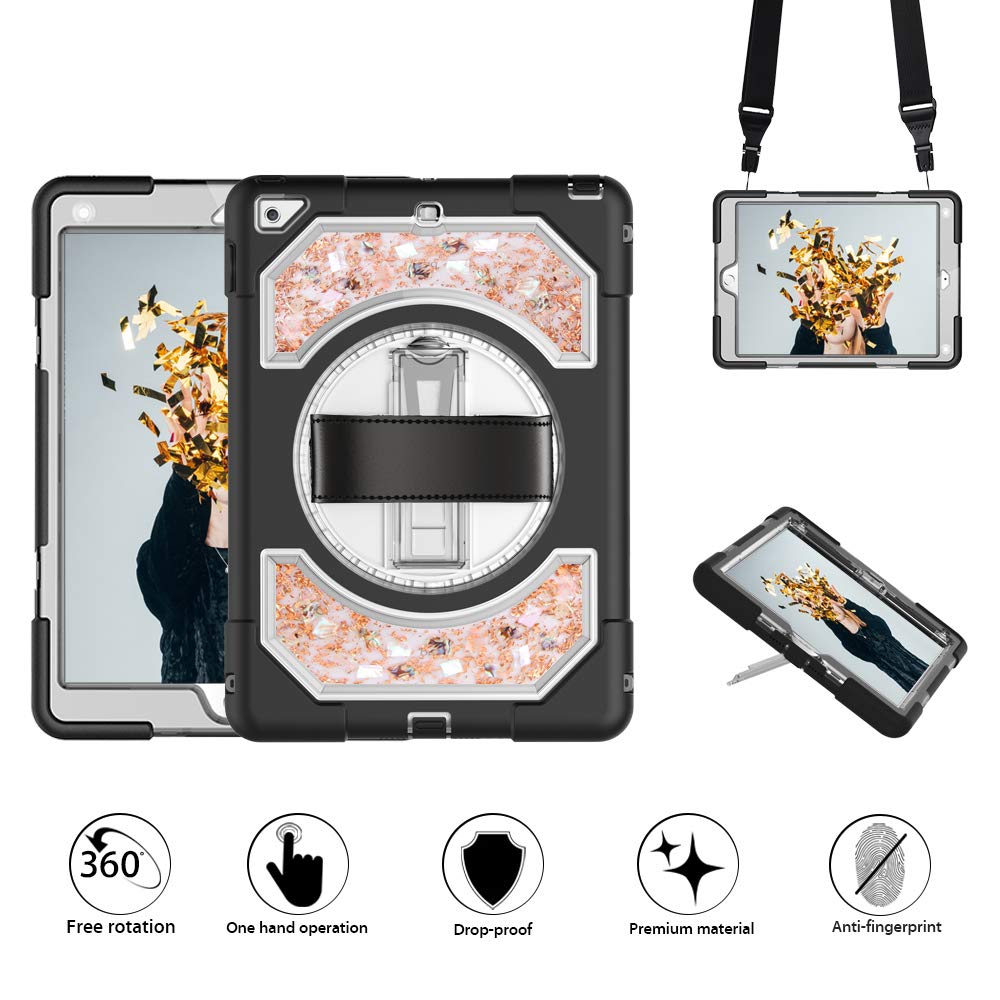 GROLEOA iPad 9.7 2018 2017 Case, iPad 6th 5th Generation Real Flower Case Cover, Easy Carrying Shockproof Case with 360 Kickstand, Leather Hand Strap & Adjustable Shoulder Strap (Black+Clear Pink)- Amazon.com