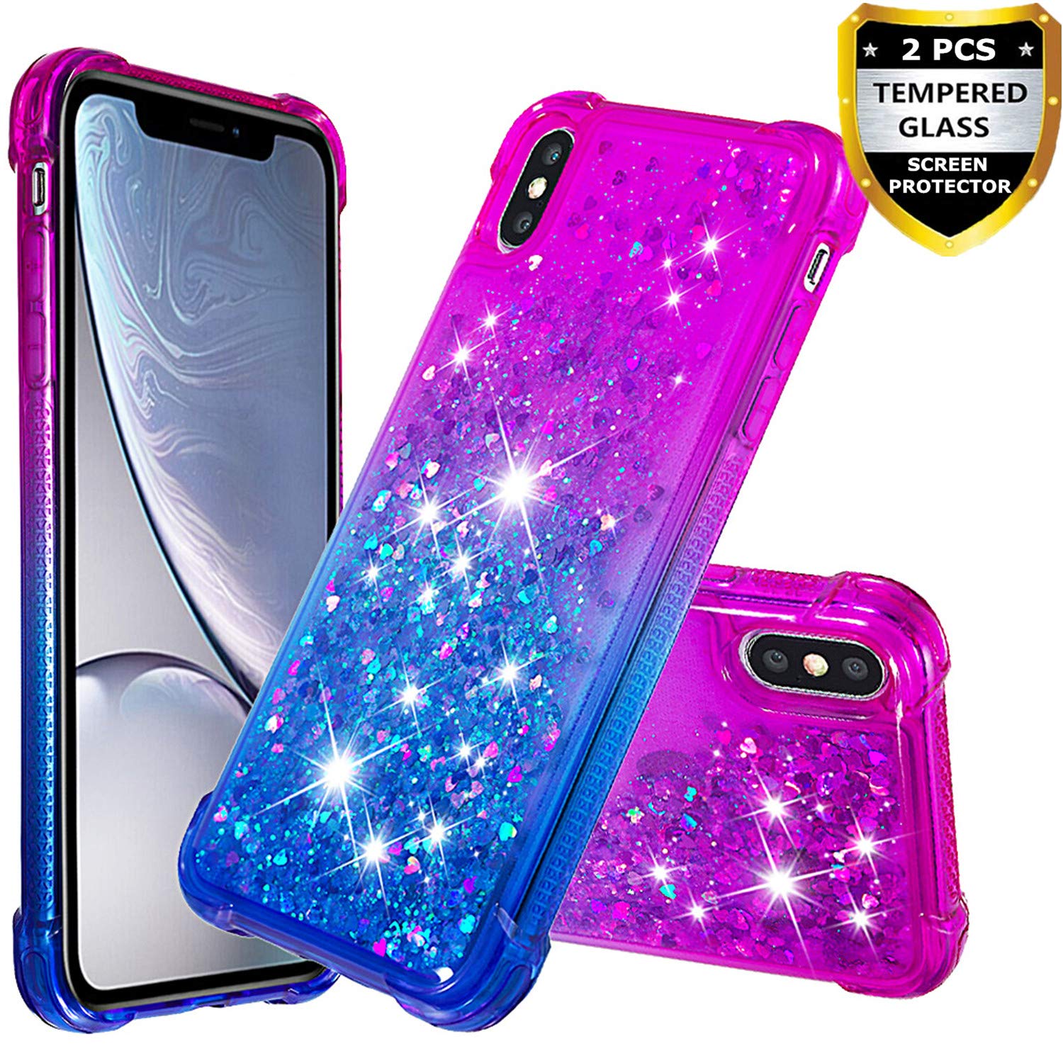 iPhone X Case, iPhone Xs Case with Tempered Glass Screen Protector [2 Pack] for Girls Women, AUMIAU Glitter Liquid Quicksand Clear Cute Soft Shockproof Case for Apple iPhone X/iPhone Xs Purple/Blue- Amazon.com