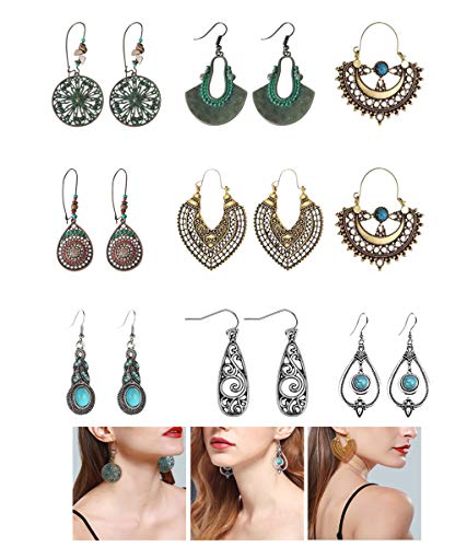 8 Pairs Vintage Statement Drop Dangle Earrings Bohemian National Style Hollow Water Drop Heart Shaped Alloy Long Boho Dangle Earrings for Women Girls (Multicolor)- Amazon.com