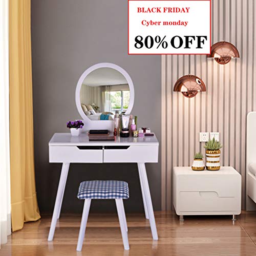 VEZARON Vanity Table Set with Round Mirror 2 Large Drawers with Sliding Rails Makeup Dressing Table with Cushioned Stool for Girls Women Bedroom Furniture (White)- Amazon.com