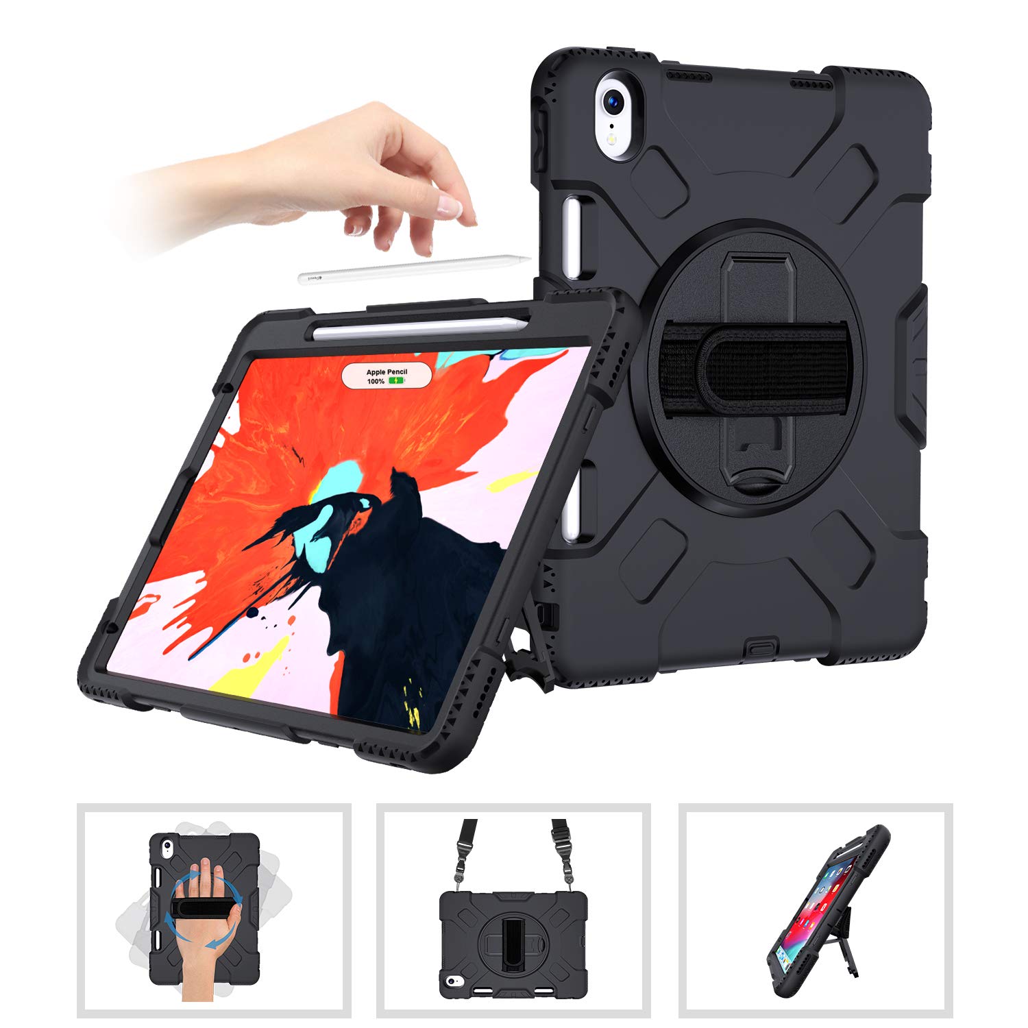 SUPFIVES iPad Pro 11 Case with Strap and Pencil Holder [Support Apple Pencil Charging/Pairing]+Hand Strap+Shoulder Strap+Stand Full-Body Heavy Duty Rugged Shockproof Case for iPad Pro 11” 2018-Black- Amazon.com