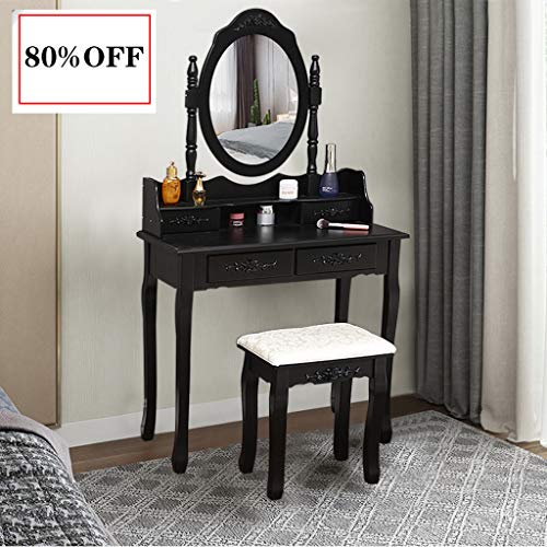 UAMSISTE Makeup Table with Rotatable Mirror and 4 Drawer, Princess Girls Women Dressing Table with Cushioned Stool, Vanity Set with Oval Mirror (Black)- Amazon.com